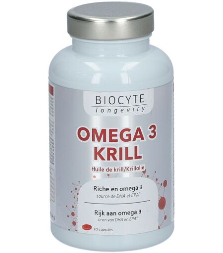 Biocyte Oméga 3 Krill est un complément alimentaire à base d'huile de krill issu de l'expertise en nutraceutique du Laboratoire Biocyte.L’acide eicosapentaénoïque (EPA) et l’acide docosahexaénoïque (DHA) contribuent à une fonction cardiaque normale. L’effet bénéfique est obtenu par la consommation journalière de 250mg d’EPA et DHA. L’acide docosahexaénoïque (DHA) contribue quant à lui, au fonctionnement normal du cerveau et au maintien d’une vision normale. On constate un effet bénéfique par la consommation journalière de 250mg de DHA.Extrait lipidique de krill de l’Antarctique Euphasia superba (huile de krill) (crustacés) dont acides gras omega 3 (acide eicosapentaénoïque EPA; acide docosahexaénoïque DHA) et astaxanthine ; Enveloppe de la capsule (gélatine ; humectants: glycérol, sirop de sorbitol ; eau ; arôme).Valeurs nutritionnelles par dose journalière recommandée (3 capsules) :Huile de krill1 500 mg dont acides gras omega 3330 mg .... dont EPA180 mg ... et DHA82,5 mg dont astaxanthine150 µgPrendre 1 à 3 capsules par jour, durant le repas. À utiliser pendant 3 mois.Conserver dans un endroit frais et sec.Tenir hors de portée des enfants.Ne pas dépasser la dose recommandée. ...