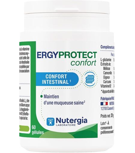 Complément alimentaire à utiliser dans le cadre d’une alimentation variée, équilibrée et d’un mode de vie sain.ERGYPROTECT Confort associe la glutamine, la vitamine B2 qui participe à protéger les cellules contre le stress oxydatif et à maintenir des muqueuses saines dont celle de l’intestin. La mélisse contribue à une fonction intestinale normale et au confort digestif. La formule est complétée par du curcuma et de la camomille.Recommandé en association avec ERGYPHILUS® Confort.ERGYPROTECT Confort pourra être conseillé pour le confort digestif, notamment en cas de stress, et pour le maintien de muqueuses normales (dont celle de l’intestin), en particulier en cas d’intolérances alimentaires.N’hésitez pas à demander les conseils d’un professionnel de santé.BénéficesSans glutenSans lactoseIngrédientsL-glutamine, extraits de mélisse (Melissa officinalis L.), de camomille (Matricaria chamomilla L.), d’oignon (Allium cepa L.) et de curcuma BCM 95® (Curcuma longa L.), peptides de caroube (Ceratonia siliqua L.), antiagglomérant : stéarate de magnésium végétal ; vitamine B2 (riboflavine). Gélule : gélatine de POISSON, colorant : oxyde de fer.Allergènes : Poisson.Valeurs nutritionnelles Pour 4 gélulesVNR*L-glutamine1000 mg-Extraits de : Mélisse160 mg- Camomille160 mg- Oignon150 mg-Curcuma120 mg-Vitamine B20,84 mg60 %*Valeurs nutritionnelles de référenceConseils d'utilisation2 à 4 gélules par jour, au cours des repas.Précautions d'emploiConserver hors de portée des enfants, à température inférieure à 25°C et à l’abri de l’humidité.Déconseillé aux femmes enceintes et allaitantes et aux enfants.L’avis d’un professionnel de santé est recommandé en cas d’usage concomitant d’anticoagulants (oignon, curcuma) et de troubles du foie et de la vésicule biliaire.Poids net60 gélulesAdresse du FabricantNUTERGIA LABORATOIRE12700 Causse et Diège ...