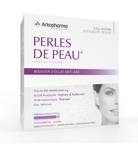 Complément alimentaire à utiliser dans le cadre d’une alimentation variée, équilibrée, d’un mode de vie sain.Arkopharma innove avec Perles de Peau® Booster d'éclat Anti-âge : une formulation spécifique anti-âge et booster d’éclat pour agir de l’intérieur permettant notamment d'hydrater, de raffermir et de repulper la peau. Une étude ex-vivo réalisée pendant 9 jours (2011) a démontré que le collagène marin de Perles de Peau® Radiance a un effet positif sur la structure de la peau. Composition:Eau - Hydrolysat de Collagène marin (poisson) - Correcteur d’acidité : acide citrique - Arôme naturel - Extrait de thalle d’Ascophylle noueuse (Ascophyllum nodosum (L.) Le Jolis) - Arôme naturel de citron - Conservateurs : sorbate de potassium et benzoate de sodium - Acide hyaluronique (sel de sodium) - Vitamine C - Gluconate de zinc - Édulcorant : sucralose - Sélénate de sodium. Valeur nutritionelle: Pour 1 flaconnette % VNR* Hydrolysat de Collagène marin 5 g Acide hyalauronique 40 mg Extrait d´Ascophylle 180 mg Vitamine C 12 mg 15 % Zinc 1.5 mg 15 % Sélenium 8.3 µg 15 % * VNR : Valeur Nutritionnelle de RéférenceConseil d'utilisation: Réservé à l’adulte.Prendre 1 flaconnette par jour à boire, de préférence diluée dans un grand verre d’eau ou de jus de fruits.Précautions d'emploi: Ne pas dépasser la dose journalière recommandée. Un complément alimentaire ne doit pas se substituer à une alimentation variée et équilibrée et à un mode de vie sain Ne pas laisser à la portée des jeunes enfants. Conserver à l’abri de la lumière, de la chaleur et de l’humidité. Contient des traces d’iode. Cette mention ne constitue pas une contre-indication à l’utilisation de ce produit chez les personnes présentant des troubles de la thyroïde.Poids net:10 Flaconnettes de 25 mlFabricant:ARKOPHARMA - Laboratoires Pharmaceutiques BP 28 06511 CARROS Cedex ...