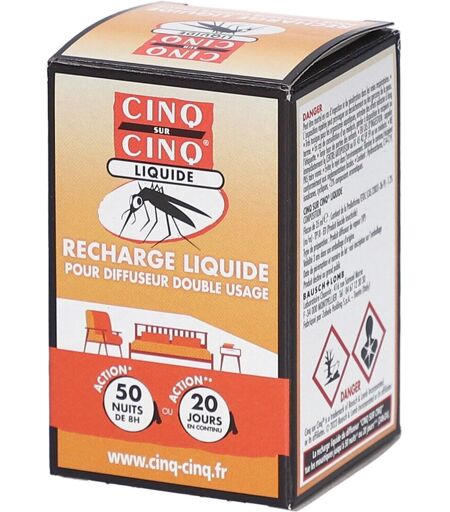 La recharge liquide d'insecticide CINQ SUR CINQ a une efficacité testée à l'intérieur contre les moustiques (Culex quinquefasciatus, Aedes albopictus, Aedes aegypti) vecteurs du virus Zika, du Chikungunya, de la fièvre jaune et de la Dengue. La recharge liquide CINQ SUR CINQ utilisée conjointement avec son diffuseur électrique protège jusqu'à 45 nuits dans une pièce de 30 m3. Pour bénéficier d’une meilleure protection dans une pièce de plus grande taille, utiliser plusieurs diffuseurs.IndicationTenir hors de portée des enfants. Ne pas utiliser dans un espace confiné : aérer suffisamment avant de séjourner dans la pièce ou laisser la fenêtre ouverte. Application1- Pousser vers le bas puis dévisser le bouchon de la recharge. 2- Placer la recharge dans le diffuseur électrique et la visser. 3- Brancher le diffuseur verticalement en utilisant la prise pivotante (220-230 volts). 4- Le flacon vide (après 450 heures) doit être remplacé par une recharge liquide CINQ SUR CINQ.Le liquide se colore légèrement dans le temps. Cela n’a aucun effet sur son effcacité.* 50 nuits de 7H ou 45 nuits de 8-10H.** Pour une meilleure diffusion, débrancher le diffuseur quelques heures dans la journée.IngrédientsContient de la Prallethrine/ETOC (CAS 23031-36-9) - 1.2% (m/m) - TP18 - ED (Produit biocide insecticide). ...