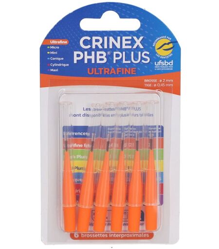 La Brossette Ultrafine PHB Plus de Crinex (blister 6 unités) est une brossette interdentaire permettant de nettoyer les espaces plus étroits entre vos dents. Ultra fine, la brossette PHB Plus Ultrafine est équipée d'une brosse de 2 mm de diamètre et d'une tige de 0,45 mm de diamètre.IndicationBrosse interdentaire ...