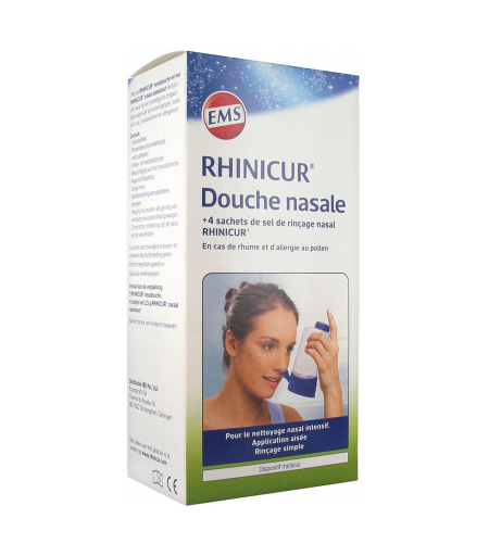 Le rinçage nasal est un moyen simple et naturel de traiter le nez. Vous pouvez la pratiquer en toute simplicité avec la Douche Nasale Rhinicur et le Sel de Rinçage Nasal Rhinicur !A utiliser en cas de mouchages fréquents, de refroidissements (en traitement préventif), d'allergies au pollen, d'infections chroniques du nez et des sinus.Utiliser la solution saline Rhinicur lors du rinçage nasal permet simultanément un apport en minéraux, ce qui stimule les fonctions cellulaires et immunitaires. Ces rinçages en douceur et en profondeur permettent d'éliminer les éléments pathogènes et allergènes ainsi que les particules étrangères, aussi bien en cas de refroidissement que de crise allergique. Sa formule contient :- de l'hydrogénocarbonate de sodium permettant une meilleure dissolution des sécrétions visqueuses et tenaces ainsi qu'une neutralisation des inflammations métaboliques<br/ ><br/ >- du sulfate de potassium favorisant le décongestionnement de la muqueuse nasale et améliorant la circulation sanguine<br/ ><br/ >- du sel de source naturel avec ses minéraux et olioéléments pour reminéraliser et revitaliser la muqueuse nasale Pour un maniement simple, un dosage exacte, une pression de rinçage réglable et un entretien aisé ! ...