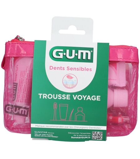 Cette trousse contient :1 GUM® brosse à dents de voyage 1 GUM® SensiVital®+ dentifrices 12ml1 GUM® SensiVital+ bain de bouche 30ml1 GUM® SOFT-PICKS Advanced bâtonnet interdentaire MediumGUM® Brosse à dents de voyage Que vous voyagiez pour le travail ou pour le plaisir, une brosse à dents fait certainement partie de votre liste – mais vous pourriez manquer d'espace dans votre bagage à main.Le design pliable de la brosse de voyage GUM TRAVEL est parfait pour vos déplacements. Elle se déplie de manière à avoir la même taille qu’une brosse à dents traditionnelle.BénéficesDesign en tryptique permettant de ranger la tête de la brosse dans le mancheManche doté de trous d'aération permettant à l'excès d'humidité de s'échapper et de garder la brosse propreBrins recouverts de chlorhexidine, agent anti-bactérien de référence, permettant de les conserver propres entre chaque utilisation.GUM® SensiVital®+ dentifricesSi vous ressentez une douleur lorsque vous consommez des boissons ou aliments froids, vous souffrez probablement de « sensibilité dentaire ».Le dentifrice GUM SensiVital + offre un soulagement rapide et durable. Il protège et renforce votre émail, tout en désensibilisant vos nerfs. Pour adultes et enfants de 7 ans et plus.BénéficesObstrue et scelle les tubuli dentinaires pour un soulagement rapideDésensibilise les terminaisons nerveuses exposéesFortifie l'émail et la dentine, et favorise la prévention des caries grâce à la combinaison de fluor (1450 ppm) et d'isomaltPrend soin des gencives grâce à une action anti-plaqueFormule douce Arôme menthe fraîcheGUM® SensiVital+ bain de bouche Les boissons et les aliments froids vous font-ils mal aux dents? Vous souffrez probablement de « sensibilité dentaire ».Le bain de bouche GUM SensiVital + offre un soulagement rapide et durable de la sensibilité et prend soin de votre santé bucco-dentaire en renforçant vos dents.BénéficesDésensibilise les terminaisons nerveuses exposéesFortifie l'émail et la dentine, grâce à la combinaison de fluor, d'isomalt et de glycérophosphate de calciumPrend soin des gencives grâce à une action anti-plaqueFormule douce sans alcoolArôme menthe fraîcheGUM® SOFT-PICKS Advanced bâtonnet interdentaire MediumGUM® Soft-Picks® Advanced est le plus pratique de nos accessoires de nettoyage interdentaire. Doux et facile à utiliser, ce bâtonnet jetable doté de brins souples en caoutchouc assure un nettoyage complet entre vos dents. Grâce à son design incurvé, moderne et ergonomique, il peut facilement atteindre toute la bouche, y compris les zones difficiles d'accès telles que les dents du fond. Ce bâtonnet est un point de départ idéal pour le nettoyage interdentaire et un excellent choix si vous avez des espaces étroits, êtes porteur d'un appareil orthodontique, de bridges ou avez des gencives fragiles.BénéficesBrins en caoutchouc souples qui glissent confortablement entre les dents pour retirer plaque dentaire et résidus alimentairesS’adapte aux petits et grands espaces interdentaires,... ...