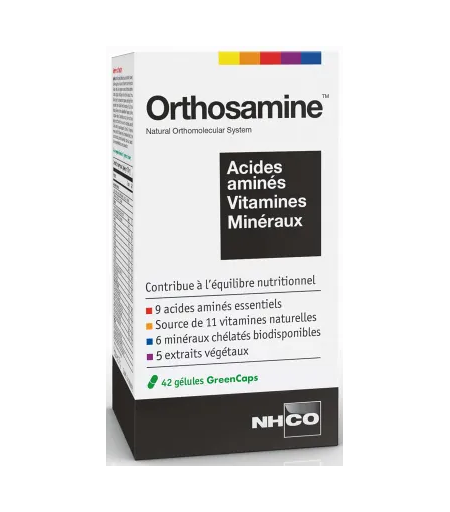 Certains nutriments essentiels, dont les vitamines, minéraux, acides aminés et antioxydants, sont indispensables au bon fonctionnement de l’organisme. Ils sont dits essentiels car notre organisme ne peut les fabriquer, ils doivent ainsi être apportés par l’alimentation.Un apport alimentaire équilibré en vitamines, minéraux et acides aminés essentiels est indispensable au bien être et au maintien en bonne santé.De nos jours, les modes de vie rendent parfois difficile une alimentation équilibrée, en adéquation avec les besoins de l’organisme. Pour formuler ORTHOSAMINE™, la recherche NHCO Nutrition® a créé un complexe nutritionnel de dernière génération, le Natural Orthomolecular System, inspiré de la science orthomoléculaire.Les Laboratoires NHCO Nutrition® proposent une formule contenant des vitamines d’origine naturelle, des minéraux amino-chélatés™ (mieux assimilés que d’autres formes de minéraux) et des acides aminés essentiels, sous forme libre.Associés à ces nutriments, des extraits végétaux ont été sélectionnés pour leurs valeurs nutritives : Goji, Grenade, Acérola, Quinoa et Lithothamne. ...