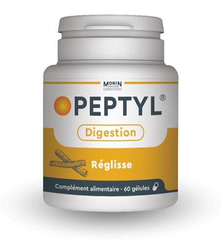 Complément alimentaire à utiliser dans le cadre d’une alimentation variée, équilibrée et d’un mode de vie sain.Grâce à sa combinaison unique d'extrait de réglisse déglycyrrhizinisé et de magnésium, PEPTYL offre un soutien efficace pour maintenir un fonctionnement normal des muqueuses de l'estomac.IngrédientsExtrait sec de réglisse déglycyrrhizinisé (glycyrrhiza glabra), tunique d'origine végétale : hypromellose, agent de charge: carbonate de magnésium, anti-agglomérant : acide stéarique.Valeurs nutritionnellesIngrédientPour 4 gélulesExtrait de réglisse1400 mgConseils d'utilisation2 à 4 gélulesPrécautions d'emploiPeptyl est un complément alimentaire, il ne peut donc pas se substituer à une alimentation variée et régulière et à un mode de vie sain.Tenir hors de portée des enfants. Pour préserver leur efficacité, consommer les gélules en prenant soin de ne pas dépasser la date figurant sous le flacon.Poids net60 gélulesAdresse du FabricantMONIN CHANTEAUD SASURUE MARIUS PETIPA 34080 MONTPELLIER ...