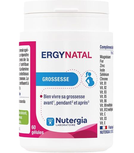 Complément alimentaire à utiliser dans le cadre d’une alimentation variée, équilibrée et d’un mode de vie sain.ERGYNATAL pourra être conseillé aux femmes en désir de grossesse, aux femmes enceintes, aux jeunes mamans et aux femmes allaitantes.Composition:Carbonate et citrate de magnésium, support : cellulose ; gluconates de fer et de zinc, magnésium marin (oxyde de magnésium), L- ascorbate de calcium, vitamines B1, B2, B3, B5, B6, B9, B12, D3, vitamine E d’origine naturelle, anti-agglomérant : acide stéarique ; chlorure de chrome, iodure de potassium, sélénite de sodium.Valeur nutritionnelle: Pour 2 gélules*AJRVitamine B11,1 mg100 %Vitamine B21,4 mg100 %Niacine (Vit.B3)16 mg100 %Acide pantothénique (Vit. B5)6 mg100 %Vitamine B61,4 mg100 %Acide folique (Vit. B9)400 µg200 %Vitamine B122,5 µg100 %Vitamine C40 mg50 %Vitamine D35 µg100 %Vitamine E d'origine naturelle6 mg50 %Fer7 mg50 %Iode75 µg50 %Magnésium112 mg30 %Zinc6 mg60 %Chrome10 µg25 %Sélénium11 µg20 %*Apport journalier de RéférenceConseil d'utilisation:2 gélules par jour au cours du repas.Précautions d'emploi:Ne pas dépasser la dose journalière conseillée. Conserver hors de portée des enfants, à T° < 25° C et à l’abri de l’humidité.Poids net:27 g = 60 gélulesFabricant:NUTERGIAB.P.5212700 CAPDENAC ...
