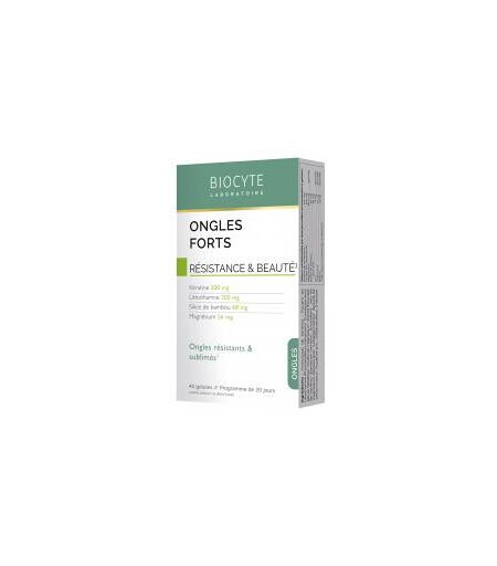 BIOCYTE ONGLES FORTS 40 GELULES Keratine. Silice de bambou. La beauté de nos ongles dépend des mauvais traitements et agressions extérieures que l'on peut leur faire subir (eau, produits chimiques, humidité, froid, stress, excès), mais également ...