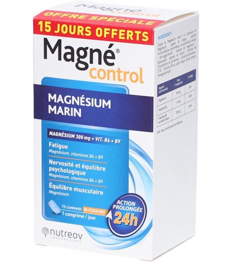 Complément alimentaire à utiliser dans le cadre d’une alimentation variée, équilibrée, d’un mode de vie sain.Le comprimé bi-couche de MAGNÉ® Control vous apporte 300 mg de magnésium, 100 % des Apports Journaliers Recommandés en vitamines B6 et B9 et assure une double diffusion des actifs : immédiate et progressive afin d'optimiser leur tolérance et leur assimilation par l'organisme au cours de la journée.Le magnésium et la vitamine B6 contribuent à un métabolisme énergétique normale et au fonctionnement normal du système nerveux. Ces 2 actifs aident également à réduire la fatigue.Les folatres (vitamine B9) contribuent à des fonctions psychologiques normales. D'origine marine, l'oxyde de magnésium est obtenu par concentration d'eau de mer.CompositionMagnésium (Oxyde et Carbonate de Magnésium), Amidon de Maïs Prégélatinisé, Epaississant : Alginate de Sodium, Antiagglomérants : Talc (E553b), Stéarate de Magnésium, Agent de Charge : Carboxymethyl Cellulose de Sodium Réticulée (E468), Vitamine B6 (Chlorhydrate de Pyridoxine), Colorant Alimentaire : E132, Oxyde d'Aluminium Hydraté, Vitamine B9 (Acide Pteroylminiglutamique).Valeur nutritionelle: Pour 1 comprimé% AJR*Magnésium300 mg100 %Vitamine B61,4 mg100 %Vitamine B9200 µg100 %* AJR = Apports journaliers recommandésConseil d'utilisation1 comprimé par jour le matin au petit-déjeuner ou le soir au coucher, à avaler avec un grand verre d'eau.Poursuivre sur une période d'1 mois et renouveler si nécessaire.Précautions d'emploiNe pas dépasser la dose journalière recommandée. Une consommation excessive peut entrainer un effet laxatif. À consommer de préférence avant la date indiquée sur l'étui. à conserver au frais, au sec et à l'abri de la lumière. Garder hors de portée des jeunes enfants.Poids net74,5 g = 75 comprimésFabricantLaboratoires Nutreov Physcience5 Avenue Louis Blériot63000 Clermont FerrantFrance ...