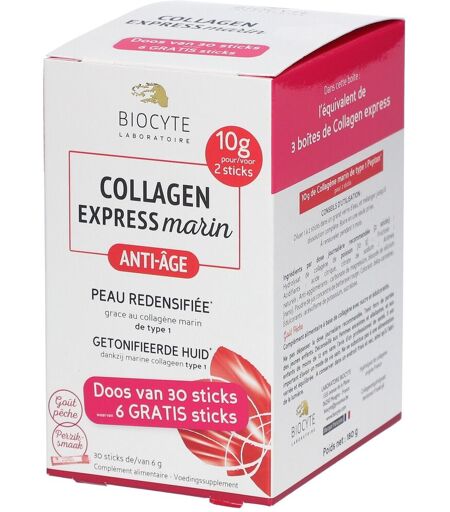 Complément alimentaire à utiliser dans le cadre d’une alimentation variée, équilibrée et d’un mode de vie sain.Biocyte Collagen Express Sticks PackL’innovation Biocyte, du collagène dans un format stick qui vous suit partout. Le collagène est la protéine la plus abondante du corps, il assure la densité et la résistance de la peau. Sa production diminue naturellement avec l'âge. Biocyte Collagen Express Marin (collagène peau) est une formule hautement concentrée en collagène pour une peau lissée, au délicieux goût pêche. Sans dioxyde de titane.IngrédientsHydrolysat de collagène de poisson; Fructose ; Acidifiants : acide citrique, citrate de sodium ; Arômes naturels ; Anti-agglomérants : carbonate de magnésium, dioxyde de silicium [nano] ; Poudre de jus concentré de betterave rouge ; Colorant : béta-carotène ; Edulcorants : acésulfame de potassium, sucralose. Allergène : poisson. Peut contenir des traces de : gluten, œufs, poissons, soja, lait, fruits à coque, céleri.Données nutritionnellesPour 2 sticks par jour : Hydrolysat de collagène marin PEPTAN 10 g 10 g Conseils d'utilisation1 à 2 sticks par jour pendant au moins 30 jours. Diluer 2 sticks par jour, dans un grand verre d’eau, et mélanger jusqu’à dissolution complète. Boire en une seule prise. À consommer de préférence pendant 1 mois.Précautions d'emploi Conserver dans un endroit frais et sec. Tenir hors de portée des jeunes enfants. Ne pas dépasser la dose recommandée. Complément alimentaire formulé à base de collagène, avec sucre et édulcorants. Déconseillé aux femmes enceintes et allaitantes, et aux enfants de moins de 12 ans. Poids net30x6gFabricantLaboratoire Biocyte1555 Avenue de la Plaine06250 MouginsFrance ...
