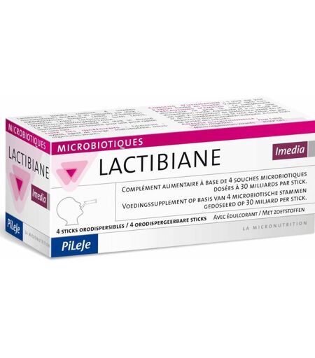 Complément alimentaire à utiliser dans le cadre d’une alimentation variée, équilibrée et d’un mode de vie sain.Lactibiane Imedia se compose de 4 souches microbiotiques. Chaque stick contient 30 milliards de micro-organismes vivants. Bifidobacterium longum LA101,Lactobacillus helveticus LA102,Lactococcus lactis LA103,Streptococcus thermophilus LA104. La poudre du stick se dissout immédiatement dans la bouche de sorte qu'il peut être pris rapidement et sans eau. Les souches microbiotiques de Lactibiane Imedia sélectionnées par Pileje sont enregistrées dans la Collection Nationale des Cultures de Micro-organismes (CNCM).Composition:Edulcorant : xylitol, agent de charge : maltodextrine, ferments lactiques. Valeur nutritionnelle: Pour 1 stickFerments lactiques30.10 Millard UFC Conseil d'utilisation:Faire fondre 1 stick par jour dans la bouche, sans eau.Précautions d'emploi:Ce produit est un complément alimentaire. Ne pas dépasser la dose recommandée. Une alimentation variée et équilibrée et un mode de vie sain sont importants. Tenir hors de portée des jeunes enfants. Garder dans un endroit sec et fermé à température ambiante, à moins d'indication contraire sur l'étiquette. Consulter un expert avant de prendre des suppléments en cas de grossesse, d'allaitement, d'utilisation de médicaments et de maladie.Poids net:4 sticksFabricant:?PILEJE SAS37 quai de Grenelle75015 PARIS ...