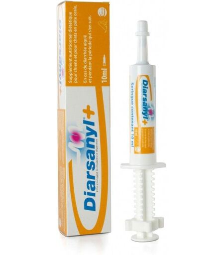 Diarsanyl Compléments alimentaires anti-diarrhée pour chiens et chats Utilisation: Chez les chiens et chats : - réduction du risque de malabsorption intestinale aiguë, en cas de diarrhée aiguë et pendant la période de rétablissement qui s'en suit. Chez les veaux et les poulains : - stabilisation du bilan des électrolytes et de l'eau, en cas de risque de troubles digestifs (diarrhée) et pendant et après ceux-ci. Avant utilisation, il est recommandé de demander l'avis d'un vétérinaire. Mode d'emploi: Voie orale. Agit en couvrant la muqueuse digestive d'un film protecteur. Administrer pendant 3 jours, selon les doses suivantes : chats, chiens de moins de 7 kg : 2 ml par jour en 2 prises, soit 1 cran (1 ml) de la seringue-doseuse de 10 ml chaque matin. chiens de 7 à 18 kg : 4 ml par jour en 2 prises, soit 1 cran (2 ml) de la seringue-doseuse de 24 ml matin et soir. chiens de 18 à 30 kg : 8 ml par jour en 2 prises, soit 2 crans (4 ml) de la seringue-doseuse de 24 ml matin et soir. chiens de plus de 30 kg: 20 ml par jour en 2 prises, soit 1 cran (10 ml) de la seringue-doseuse de 60 ml matin et soir. Placer l'embout de la seringue dans la bouche au niveau de la commissure des lèvres de l'animal. Enfoncer le piston de la seringue. Le cran du piston doit rentrer à l'intérieur de la seringue. ...