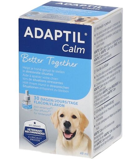 Utilisez tous les mois la Recharge ADAPTIL Calmpour continuer à aider votre chien à surmonter son stress et à s’adapter à son environnement intérieur lorsqu’il est confronté à des situations difficiles, par exemple lorsqu’il est laissé seul à la maison, lors de bruits intenses ou en présence de visiteurs. Elle renforce votre complicité en créant un environnement rassurant à la maison. Son effet continu assure le bien-être permanent de votre chien. Scientifiquement prouvé, utilisé et recommandé par des vétérinaires et des éleveurs canins. Bénéfices: La Recharge ADAPTIL Calmdoit être utilisée avec le Diffuseur ADAPTIL Calm. La recharge a une durée d’action de 30 jours (48 ml). Elle permet de couvrir une surface allant jusqu’à 70 m2. Évitez de brancher le diffuseur sous une étagère ou derrière une porte, des rideaux ou des meubles car cela nuirait au bon fonctionnement du dispositif. Conseils d'utilisation: Prêt à l’emploi : visser le flacon sur le dispositif du diffuseur et branchez-le sur une prise électrique. Laissez le diffuseur allumé en permanence. Dosage: Une recharge permet de couvrir une surface allant jusqu’à 70 m2. Composition: Analogue de phéromone apaisante de chienne allaitante, Excipients. Il est indispensable de demander l’avis de votre vétérinaire ou de votre pharmacien. Si les symptômes persistent, consultez votre vétérinaire. ...