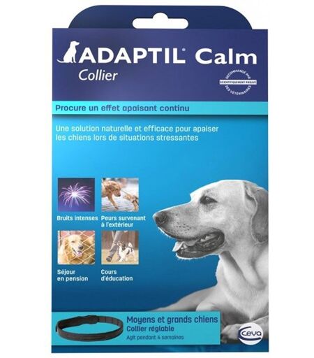 Adaptil collier contient un analogue synthétique de la phéromone produite naturellement par la chienne en période d'allaitement. Cette phéromone a des propriétés rassurantes et apaisantes sur le chiot.Adaptil collier aide donc le chien à s'adapter à son nouvel environnement, et à apaiser son stress dans les situations suivantes : situations à risque (orages, feux d'artifice) pendant les cours d'éducation, la réceptivité du chien à l'apprentissage est améliorée période de socialisation, le chiot a plus confiance en lui séjour en pension, transport et voyages En cas d'hyperactivité ou d'agressivité, il n'est pas recommandé d'utiliser Adaptil.Mode d'emploiAjustez le collier autour du cou, assez près de la peau pour que la chaleur corporelle favorise la diffusion du produit. Le collier a une durée d'efficacité de 4 semaines pendant lesquelles il doit être porté en permanence (sauf en cas de bain).Dès l'arrivée du chiot, il est conseillé d'utiliser le collier Adaptil pendant 1 mois.CompositionPour un collier de 100 g : Analogue de phéromone apaisante de chienne allaitante : 5g ...