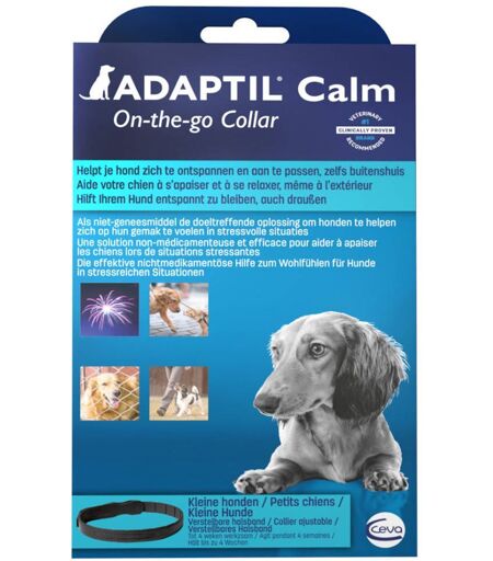 ADAPTIL® Calm On-the-go Coller Le collier Calm On-The-Go d'ADAPTIL est une excellente solution pour aider votre chien à rester calme et à s'adapter à des situations telles que les bruits forts, le dressage, la pension et l'anxiété, même à l'extérieur. Vous rapproche de votre chien en le rassurant en permanence. Testé cliniquement. Utilisé et recommandé par les vétérinaires Application : Il suffit de placer le collier autour du cou de votre chien et de l'ajuster à sa taille. Laissez ensuite le collier à votre chien en permanence (sauf lors du lavage). Pour les chiens pesant jusqu'à 15 kg, utilisez un petit collier. Pour les chiens pesant jusqu'à 50 kg, prenez un grand collier. ...