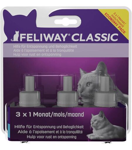 Utilisez la recharge FELIWAY Classic chaque mois afin de continuer à créer un foyer aimant et confortable où vous et votre chat serez toujours "heureux ensemble".Nourrit votre relation avec votre chat, en créant un environnement affectueux à la maison. Son effet continu procure un confort constant à votre chat.Cliniquement prouvé et recommandé par les vétérinaires.FELIWAY Classic recharge nécessite un diffuseur FELIWAY Classic.La recharge dure jusqu'à 30 jours (48 ml).Elle couvre une surface allant jusqu'à 70 m2Évitez de brancher le diffuseur sous des étagères, derrière des portes, derrière des rideaux ou derrière des meubles car il ne fonctionnera pas.IndicationsAide à l'apaisement et à la tranquilité.Conseils d'utilisationUtiliser uniquement avec le diffuseur Feliway.Lire la notice du diffuseur.CompositionAnalogue de phéromone féline faciale F3 (2%), Hydrocarbure isoparaffinique.Précautions d'emploiTenir hors de la portée des enfants. Lire le mode d'emploi avant utilisation.En cas d'ingestion: Appeler immédiatement un centre anti-poison ou un médecin. Ne pas faire vomir. Eliminer le contenu en accord avec les réglementations locales et nationales.Conditionnement3 flacons de recharge ...