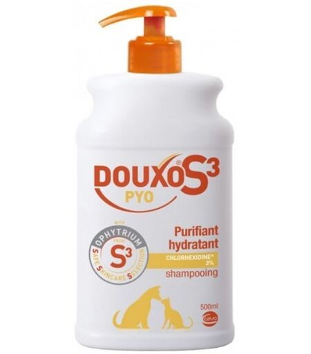Douxo® Pyo S3 Chlorhexidine 3% Shampooing antiseptique 500ml Le shampooing Douxo® Pyo S3 Chlorhexidine à 3% de chlorhexidine a été spécialement conçu pour le soin antiseptique de la peau des chiens et des chats. Il nettoie et protège efficacement les peaux sensibles contre les micro-organismes. Application: Appliquez le shampooing sur le pelage mouillé, massez délicatement et laissez agir quelques minutes. Rincez ensuite abondamment à l'eau. Répétez l'application si nécessaire. ...