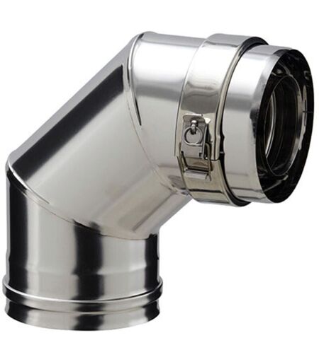 Coude 90° - Finition : inox - Fournisseur: POUJOULAT - Reference: 37080741 9999 - Coude permettant la réalisation de dévoiement dans le conduit de fumée. Étanchéité mécanique obtenue par un emboîtement cône sur cône. Existe en 2 couleurs : inox et noir mat ...
