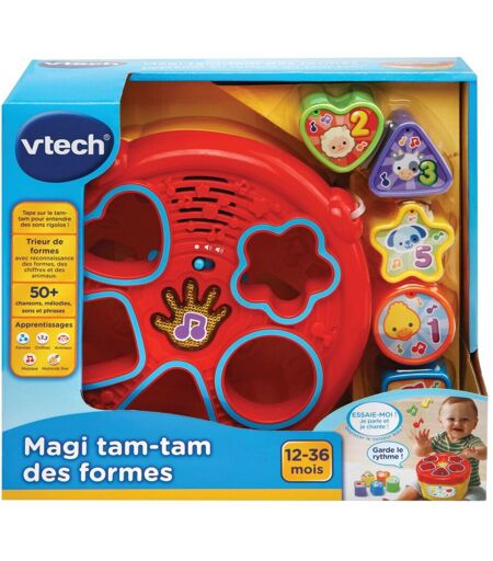 VTECH Magi Tam-Tam Des Formes - Bébé tape avec ses mains sur le tam-tam et déclenche des sons rigolos._x000D_ 1 trieur de formes avec 5 blocs colorés a insérer pour découvrir les formes, les chiffres et les animaux._x000D_ Bébé souleve le couvercle du tam-tam pour ranger ou récupérer ... ...