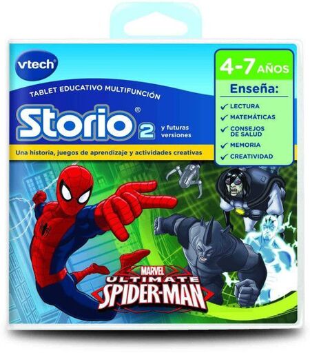 JOUET EN ESPAGNOL Apprend avec ton Superhéros préféré! Grâce à ce fantastique jeu de Spiderman les plus petits apprendront sur les animaux, la science, les groupes alimentaires et le type des matériaux. Les plus petits pourront lire l?histoire de Spiderman contre les 6 sinistres, s?amuser avec les 2 modes de jeu ou faire des photos avec ton superhéros préféré! Compatible avec : Storio 2, 2 baby et Storio 3S. ...