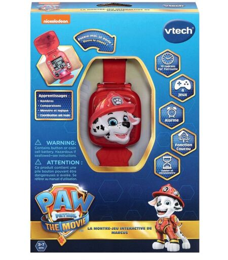 Pat Patrouille Le Film - La montre-jeu interactive de Marcus - 3 - 7 ans. Une montre multifonction parlante aux couleurs du c?l?bre h?ros de la Pat'Patrouille : Marcus. G?nial ! Le visages du c?l?bre chiot est en 3D !. 4 activit?s ?ducatives pour jouer et apprendre avec les h?ros Pat'Patrouille et de nombreuses fonctions dont l'affichage de l'heure, un mode alarme, un chronom?tre?. 10 cadrans Pat' Patrouille pour personnaliser sa montre.. Double affichage de l'heure : analogique ou digital.. Fonctions alarme/ r?veil, coucou (qui retentit toutes les heures, fonction d?sactivable) chronom?tre et sablier pour d?limiter un temps donn?.. Avec la vraie voix de Ryder.. Arr?t automatique. Bo?te Try-me.. Fonctionne avec une 1 pile-bouton CR2450 fournie. ...