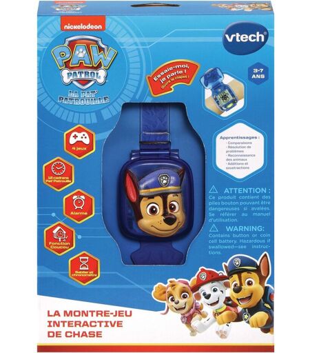 Une montre multifonction parlante aux couleurs de Chase, le c?l?bre h?ros de la Pat' Patrouille.. Avec un ?cran anim? pour jouer et apprendre avec ses h?ros pr?f?r?s !. 12 cadrans Pat' Patrouille pour personnaliser sa montre. 1 bouton lumineux pour jouer avec son h?ros pr?f?r?. 4 jeux pour faire des d?couvertes, apprendre ? compter, d?couvrir les nombres et les formes. Double affichage de l'heure : analogique ou digital. Fonctions alarme/ r?veil, coucou (qui retentit toutes les heures, fonction d?sactivable) chronom?tre et sablier pour d?limiter un temps donn?. Avec la vraie voix des personnages.. Arr?t automatique.. Bo?te Try-me.. Fonctionne avec une pile CR2450 incluse. ...