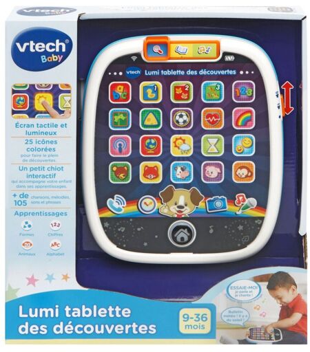 La première tablette tactile et lumineuse des tout-petits !. 25 touches tactiles dont 20 lumineuses pour faire le plein de découvertes : les chiffres, les formes, l'alphabet en chansons, les animaux, découvrir le temps qu'il fait, écouter son ami le chien parler.. 3 modes de jeux : découverte, apprentissage et musique.. 20 malodies et 3 chansons. Réglage du volume sonore et arrêt automatique.. 3 piles AAA fournies. De 9 à 36 mois ...