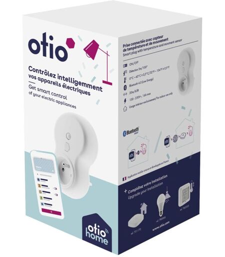Prise connectée avec capteur de température et de mouvement - Otio Entrez dans l'univers OtioHome et expérimentez la maison connectée ! Grâce à son application mobile unique et à sa gamme de produits connectés complète, OtioHome vous permet de piloter tous les objets du domicile par télécommande, smartphone ou assistant vocal. La prise connectée OtioHome est dotée d'un capteur de température et de mouvement, ce qui vous permet de réguler la température intérieure en branchant votre radiateur/ventilateur et d'activer/désactiver vos éclairages automatiquement. Elle est compatible avec les assistants vocaux Google Home et Amazon Alexa. Caractéristiques techniques Matériau : Plastique Dimensions : [Dimensions non visibles sur l'image] Poids : [Poids non visible sur l'image] Connectivité : Bluetooth 4.0 (Low Energy) Alimentation : 100-250V - 1.6A max Température de fonctionnement : 0°C - 40°C (+0,5°C/32°F - 104°F ±0,9°F) Détection de mouvement : 5m/100° Utilisation : Intérieur uniquement ...