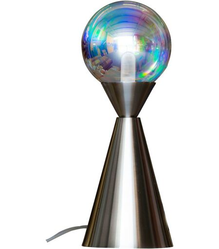 Lampe décorative à poser en métal et verre fumé 40 W Compatible lampe LED. (Ampoule non fournie) Lampe à poser au design moderne idéale pour illuminer un espace de votre chambre, salon, bureau ou toute autre pièce de votre habitation. Cette lampe de chevet pour chambre à coucher ou lampe de salon pour pièce à vivre créera une ambiance unique dans votre pièce. Avec sa hauteur de 35 cm, cette lampe à de quoi offrir une splendeur rayonnante en lampe de salon ! La boule en verre fumé de la lampe à poser, protège une ampoule G9 - 40 W (non incluse). Son pied cônique en métal lui confère un look quelque peu psychédélique des années 70. Descriptif : Couleur : Argent Matériau : Pied en métal / Abat-jour en verre Usages spécifiques : Usage intérieur uniquement Dimensions : Hauteur : 35 cm - Diamètre : 13 cm Caractéristiques techniques : Type d'ampoule compatible : LED, Halogène, Fluo compacte Type de culot : G9 Nombre d'ampoules : 1 (non incluse) Puissance : 40 Watts Branchement : lampe ...