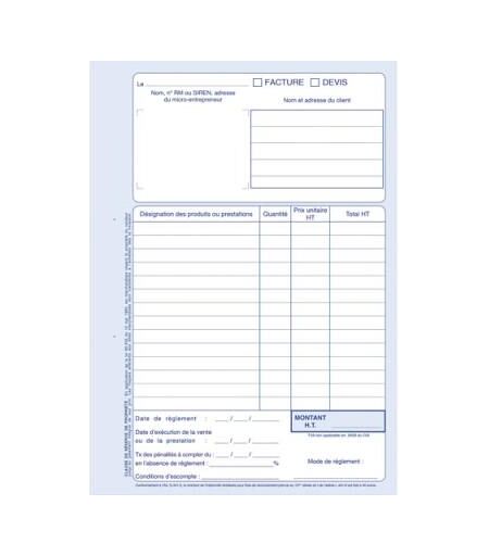 Manifold autocopiant auto-entrepreneur FACTURES Format 21x29,7 cm 40 feuillets pré-imprimés : 1 original + 1 duplicata Feuillets numérotés ...
