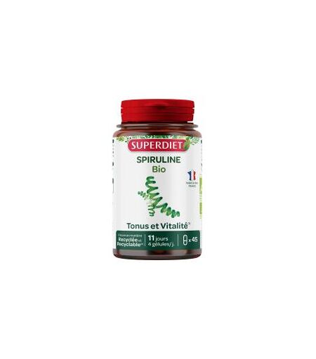 Superdiet Spiruline Bio 45 Unités est spécialement formulé pour soutenir l’énergie, la vitalité et le bon fonctionnement des défenses naturelles de l’organisme.Issu d’une micro-algue d’eau ...