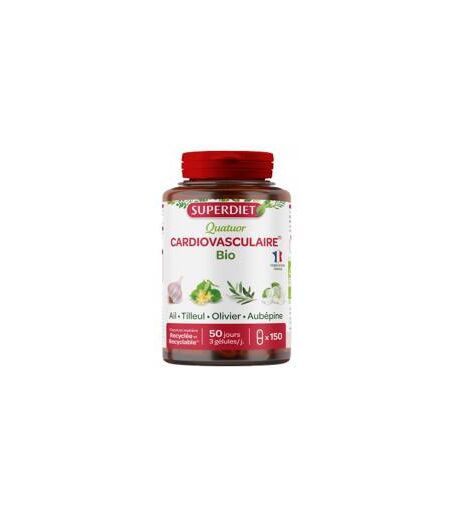 Superdiet Quatuor Ail Cardiovasculaire BioAil Olivier Tilleul Aubépine - 150 Gélules est un complément alimentaire qui :- aide à entretenir le système cardiovasulaire,- aide à maintenir un taux de ...