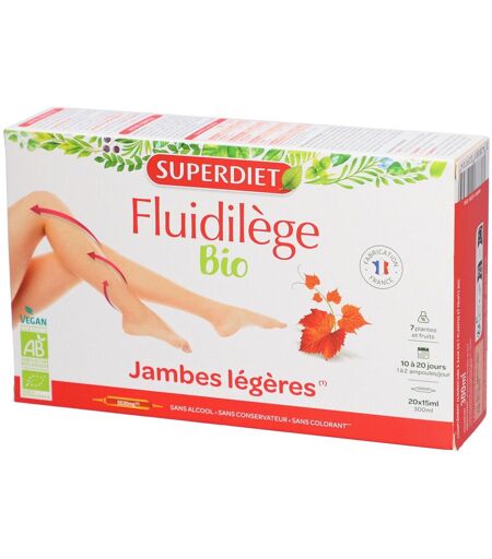Complément alimentaire à utiliser dans le cadre d’une alimentation variée, équilibrée et d’un mode de vie sain.Superdiet Fluidilège Bio est un complément alimentaire à base de vigne rouge et d’un complexe exclusif de 9 plantes issues de l’agriculture biologique. La vigne rouge, l’hamamélis, le cassis et le petit houx contribuent à la sensation de jambes légères. Le ginkgo aide à maintenir une bonne circulation. Noisette, raisin rouge, mélilot et canneberge complètent la formule.IngrédientsExtrait fluide de vigne rouge* (feuilles) (*Ingrédient issu de l’agriculture biologique).Valeurs nutritionnelles Pour 1 ampouleAJR* Extrait fluide de vigne rouge1125 mg- Conseils d'utilisationPrendre 1 à 2 ampoules par jour, pures ou diluées dans un demi-verre d’eau. Bien agiter avant emploi.Précautions d'emploiDéconseillé aux femmes enceintes ou allaitantes. Ne pas utiliser en cas d’hypersensibilité au ginkgo. Demander l’avis d’un médecin en cas de prise d’anticoagulants, de troubles de la coagulation ou avant une intervention chirurgicale. Ne pas dépasser la dose recommandée. Tenir hors de portée des jeunes enfants.Poids net20 x 15 ml = 300 mlAdresse du FabricantLaboratoires SUPER DIET185 Boulevard de la Liberté59000 Lille ...