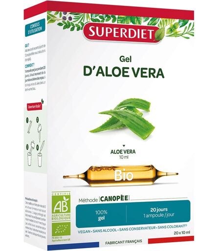 Complément alimentaire à utiliser dans le cadre d’une alimentation variée, équilibrée et d’un mode de vie sain.Le gel d’aloe vera bio est issu de la pulpe centrale de la feuille. Utilisé depuis plus de 5000 ans, il contribue au confort digestif et à l’hydratation. Ce produit est obtenu selon la méthode CANOPÉE, une technique d’extraction douce pour préserver la qualité et les bienfaits de la plante.IngrédientsGel d’Aloe Vera* (mucilage de la zone centrale de la feuille) (*Ingrédient issu de l’agriculture biologique)Valeurs nutritionnelles Pour 1 ampoule de 10 mlAJR* Gel d’Aloe Vera (Aloe barbadensis)10 ml- Conseils d'utilisation1 ampoule par jour pendant 20 jours, à tout moment de la journée, de préférence en dehors des repas. À boire pure ou diluée dans un demi-verre d’eau.Précautions d'emploiDéconseillé aux enfants de moins de 12 ans, ainsi qu’aux femmes enceintes ou allaitantes. L’usage prolongé est déconseillé. Ne pas dépasser la portion recommandée. Tenir hors de la portée des enfants.Poids net20 x 10 ml = 200 mlAdresse du FabricantLaboratoires SUPER DIET185 Boulevard de la Liberté59000 Lille ...