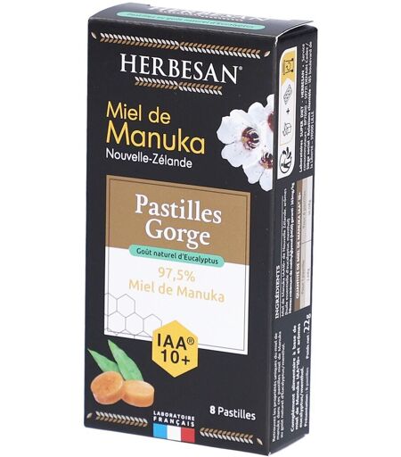 Complément alimentaire à utiliser dans le cadre d’une alimentation variée, équilibrée et d’un mode de vie sain.Ces pastilles gorge Herbesan sont composées à 97,5 % de miel de Manuka IAA® 10+, reconnu pour ses propriétés uniques scientifiquement mesurées. Le Manuka, arbrisseau originaire de Nouvelle-Zélande, appartient à la même famille que le Tea Tree. Ce miel est certifié pour son activité par un indice indépendant (IAA®). La formule est enrichie en arômes naturels d’eucalyptus/menthol pour un goût rafraîchissant.IngrédientsMiel de Manuka IAA® de Nouvelle-Zélande, arômes (goût naturel eucalyptus/menthol), huile essentielle d’eucalyptus (arôme), menthol.Niveau minimum de méthylglyoxal (MGO) garanti : 263 mg/kgValeurs nutritionnelles Pour 1 pastillePour 6 pastilles Miel de Manuka IAA® 10+2,68 g16,08 g Conseils d'utilisationSucer lentement les pastilles. Adultes et enfants à partir de 6 ans : 3 à 6 pastilles par jour, selon les besoins.Précautions d'emploiDéconseillé aux personnes allergiques aux produits de la ruche. Ne pas dépasser la dose journalière recommandée. À utiliser sous surveillance d’un adulte chez les enfants. Conserver à l’abri de l’humidité et de la chaleur, à température inférieure à 20 °C.Poids net8 pastilles = 22 gAdresse du FabricantLaboratoires SUPER DIET185 Boulevard de la Liberté59000 Lille ...