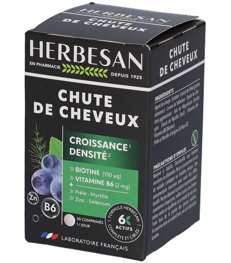 Complément alimentaire à utiliser dans le cadre d’une alimentation variée, équilibrée et d’un mode de vie sain.Herbesan Chute de Cheveux est un complément alimentaire formulé avec 6 actifs ciblés : prêle, myrtille, biotine (vitamine B8), vitamine B6, zinc et sélénium. Il contribue à la croissance, la résistance et la densité des cheveux, tout en soutenant la protection cellulaire contre le stress oxydatif. Convient à tous types de cheveux.IngrédientsSorbitol, extrait de prêle (parties aériennes), levure de sélénium, oxyde de zinc, sels de magnésium d'acides gras, extrait de myrtille (fruit), vitamine B6, vitamine B8 (biotine). Prêle et myrtille d’origine UE / non UE.Valeurs nutritionnelles Pour 1 compriméAJR* Prêle100 mg- Myrtille20 mg- Zinc15 mg150 % Vitamine B62 mg143 % Vitamine B8 (Biotine)150 µg300 % Sélénium50 µg90 % Conseils d'utilisationPrendre 1 comprimé par jour, de préférence le matin ou le midi pendant un repas, avec un grand verre d’eau.Précautions d'emploiRéservé à l’adulte. Déconseillé aux femmes enceintes ou allaitantes, et aux personnes souffrant de maladies cardiaques ou rénales. Ne pas dépasser la dose recommandée. Tenir hors de portée des enfants. Conserver dans un endroit frais, sec et à l’abri de la lumière.Poids net30 comprimésAdresse du FabricantHerbesan185, Boulevard de la Liberté59000 Lille ...