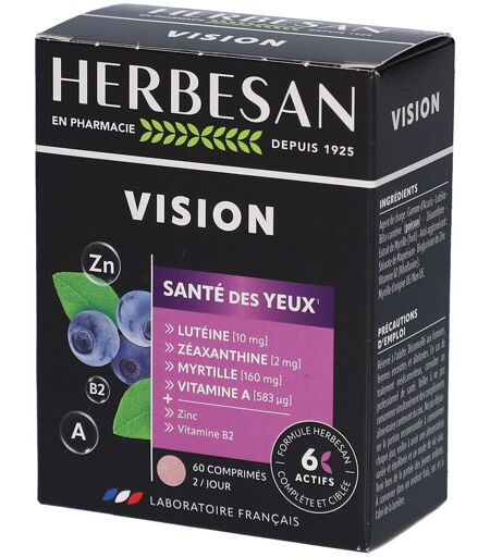 Complément alimentaire à utiliser dans le cadre d’une alimentation variée, équilibrée et d’un mode de vie sain.Herbesan Vision est un complément alimentaire qui associe 6 actifs essentiels pour maintenir la santé des yeux. Lutéine et zéaxanthine soutiennent la rétine, la myrtille riche en anthocyanes colore naturellement la formule. Le zinc et la vitamine A contribuent à une vision normale, et la vitamine B2 aide à protéger les cellules du stress oxydatif.IngrédientsGomme d’acacia, lutéine, bêta-carotène (POISSON), zéaxanthine, extrait de myrtille (fruit), stéarate de magnésium, bisglycinate de zinc, vitamine B2 (riboflavine).Allergènes : Poisson.Valeurs nutritionnelles Pour 2 comprimésAJR* Myrtille160 mg- Lutéine10 mg- Zinc10 mg100 % Bêta-carotène6,5 mg65 % Équivalent en vitamine A583 µg73 % Zéaxanthine2 mg- Vitamine B21,4 mg100 % Conseils d'utilisationAdultes : prendre 2 comprimés par jour, de préférence le midi pendant le repas, avec un grand verre d’eau.Précautions d'emploiRéservé à l’adulte. Déconseillé aux fumeurs, femmes enceintes ou allaitantes. En cas de traitement médical, consulter un professionnel de santé. Ne pas dépasser la dose recommandée. Tenir hors de portée des enfants.Poids net60 comprimésAdresse du FabricantHerbesan185, Boulevard de la Liberté59000 Lille ...