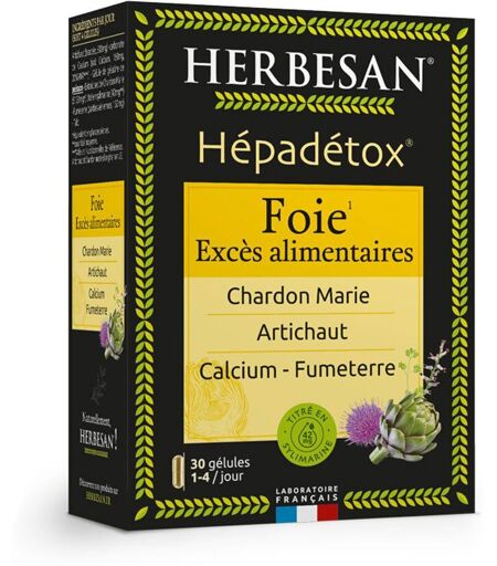Complément alimentaire à utiliser dans le cadre d’une alimentation variée, équilibrée et d’un mode de vie sain.Lendemain de fête, repas riches et copieux, Hépadétox est une formule complète avec 3 plantes, du calcium et du chlorure de choline.3 PLANTES : ARTICHAUT + CHARDON MARIE + FUMETERREHerbesan ® vous propose d’associer la fumeterre, le chardon marie et l’artichaut dans cette formule à la teneur garantie en cynarine, actif naturel de l’artichaut. L’artichaut permet un fonctionnement du foie. Chaque dose journalière d’Hépadétox® (4 gélules) vous apporte 498,4 mg d’Artichaut, 110 mg de Fumeterre, et 50 mg de Chardon Marie.CALCIUM Hépadétox® vous apporte chaque jour 160 mg de calcium soit 20% des Valeurs Nutritionnelles de Référence.CHLORURE DE CHOLINEHépadétox® vous apporte chaque jour plus d’un milligramme de chlorure de choline.Conseils d'utilisation3 à 4 gélules par jour à prendre au cours des repas.Précautions d'emploiDéconseillé aux femmes enceintes et allaitantes et aux enfants de moins de 12 ans. Déconseillé en cas d’allergie à la famille des Astéracées et en cas d’obstruction des voies biliaires. Il est recommandé de respecter les doses conseillées, de veiller à avoir une alimentation variée et équilibrée et un mode de vie sain. Tenir hors de portée des jeunes enfants.Poids net30 gélulesAdresse du FabricantHERBESAN® Laboratoires SUPER DIET 185 Boulevard de la Liberté 59000 Lille ...