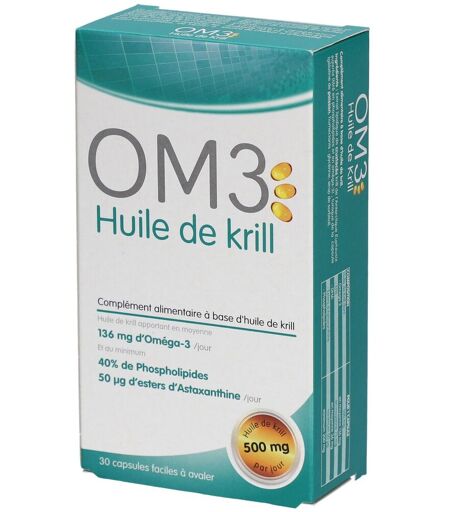 Complément alimentaire à utiliser dans le cadre d’une alimentation variée, équilibrée et d’un mode de vie sain.Les oméga-3 sont essentiels car l’organisme ne peut pas les fabriquer. OM3 Huile de Krill est un complément alimentaire issu de krill antarctique Euphausia superba. Cette huile apporte naturellement des oméga-3, des phospholipides marins et de l’astaxanthine. Elle est obtenue par une méthode respectueuse de l’environnement (Eco Harvesting®). Chaque capsule contient en moyenne 136 mg d’oméga-3, 200 mg minimum de phospholipides et 50 µg d’esters d’astaxanthine.IngrédientsExtrait huileux de CRUSTACÉS (krill antarctique Euphausia superba), enveloppe de la capsule : gélatine de POISSON, humectants : glycérine, sirop de sorbitol.Allergènes : Crustacé, Poisson.Valeurs nutritionnelles Pour 1 capsule Huile de krill500 mg Oméga-3136 mg - dont DHA60 mg - dont EPA36 mg Phospholipidesmin. 200 mg Esters d’Astaxanthine50 µg Conseils d'utilisationPrendre 1 capsule par jour, au cours d’un repas.Précautions d'emploiDéconseillé aux personnes allergiques aux fruits de mer. Ne pas dépasser la dose journalière recommandée. Tenir hors de portée des jeunes enfants. Ne se substitue pas à une alimentation variée et équilibrée.Poids net30 capsules ...