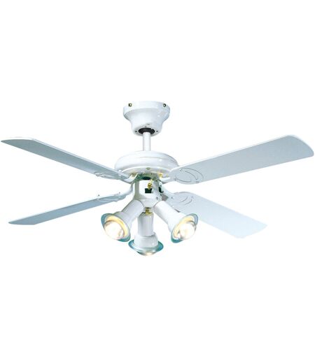 Ventilateur de plafond MALDIVES 55W - Diamètre 107cm - 4 pales en MDF (certifiées FSC) - Finition : moteur en blanc et pales blanches - Sélecteur 3 vitesses à chaînette - Réversible pour rafraichir en douceur l'ensemble d'une pièce de manière prolongée l'été, mais aussi brasser l'air l'hiver afin d'optimiser le chauffage - 3 spots luminaire avec douille E27 pour ampoule standard (non fournie - ampoule à économie d'énergie recommandée). Très silencieux. Compatible avec télécommande universelle de ventilateur de plafond (vendue séparemment). ...
