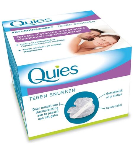 Pendant le sommeil, les muscles et les tissus se relâchent, rétrécissant ainsi le diamètre du pharynx. Le passage « forcé » de l’air provoque la vibration des tissus : c’est le ronflement. Quelle solution adopter pour cesser de ronfler? L’orthèse d’avancée mandibulaire est un dispositif médical qui permet d’agir sur le ronflement et l’apnée du sommeil modérée(1). En maintenant la mâchoire inférieure en position légèrement avancée (quelques millimètres), les voies respiratoires vont s’ouvrir permettant ainsi le passage de l’air. L’orthèse anti-ronflement Quies s’adapte facilement à toutes les morphologies dentaires par thermoformage. L’empreinte dentaire se fait aisément au domicile en 10 mn. L’orthèse assure une tenue parfaite et un confort optimal. Les gouttières dentaires thermoformables de l’orthèse Quies permettent une utilisation à long terme tout en ménageant la denture. Cet appareil anti-ronflement permet de dégager les voies respiratoires obstruées en avançant la mâchoire inférieure de quelques millimètres. Six bandes souples de tailles différentes sont proposées pour un réglage de l’avancement mandibulaire adapté au besoin de chacun. Conseil d'utilisation Adaptation de la gouttière supérieure Mettre l’indicateur de température dans une casserole remplie de 7 à 8 centimètres d’eau froide et faire monter l’eau en température. Stopper la source de chaleur lorsque le centre de l’indicateur de température passe du vert au rouge. (Température optimale). Laisser la gouttière supérieure 3 minutes dans l’eau chaude. Installez-vous en face d’un miroir. Sortir la gouttière de l’eau chaude avec une cuillère, la secouer pour éliminer l’eau. A l’aide de vos pouces placés de chaque côté, insérer la gouttière en alignant le trait vertical noir entre les deux incisives centrales supérieures. Veiller à aligner la gouttière avec l’ensemble de la denture, mordre fortement et presser la face avant de la gouttière contre le côté des dents avec les doigts. Relâcher la pression des dents et rincer la bouche à l’eau froide. Laisser refroidir 2 minutes en bouche. Adaptation de la gouttière inférieure (crochets à l’arrière) Refaire la même opération décrite en 1 pour la gouttière inférieure, mais respecter les consignes suivantes : Garder la gouttière supérieure en bouche Aligner le trait noir de la gouttière inférieure avec celui de la gouttière supérieure. ...