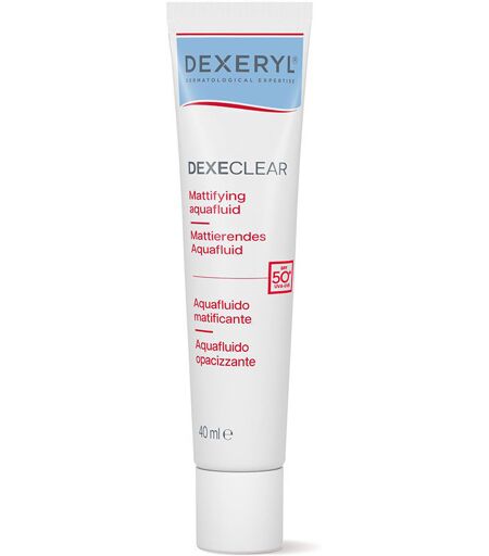 DEXECLEAR fluide aquamatisant SPF50+. Traitement de l’acné, des pores et des points noirs - Traitement matifiant. Type de peau: Grasse, Avec acné. Textures: Fluide. Formulation: Non comédogène, Sans parfum. Produit de parapharmacie. Protection SPF: SPF 50 + très élevé ...