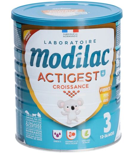 Il est important d'avoir une alimentation variée et équilibrée et un mode de vie sain.Modilac Actigest+ Croissance 3 - Lait infantile 12-36 moisModilac Actigest+ Croissance 3 est une formule de lait infantile spécialement conçue pour les enfants de 12 à 36 mois. Enrichi en fibres (FOS et GOS) pour favoriser la digestion, il est également sans huile de palme. Ce lait répond aux besoins nutritionnels des jeunes enfants en croissance.IngrédientsLait écrémé, huiles végétales (tournesol oléique, colza, tournesol), maltodextrine, lactose, galacto-oligosaccharides (GOS), fructo-oligosaccharides (FOS), phosphate de calcium, citrate de sodium, carbonate de calcium, vitamines (A, C, D, E, K1, B1, B2, B6, B9, B12, niacine, biotine, acide pantothénique), taurine, chlorure de sodium, sulfate de fer, sulfate de zinc, sulfate de cuivre, iodure de potassium, sélénite de sodium, extrait riche en tocophérols, huile de poisson, L-carnitine.Données nutritionnelles Analyse Nutritionnelle Pour 100 g Pour 100 ml reconstitué Valeur énergétique 407 kJ / 97 kcal 267 kJ / 64 kcal Matières grasses 3,8 g 1,0 g dont acides gras saturés 0,7 g 0,2 g Acide linoléique 500 mg 130 mg Acide alpha-linolénique 80 mg 20 mg Glucides 11 g 5,5 g dont sucres 5,0 g 2,5 g Fibres alimentaires 1,0 g 0,5 g Protéines 1,8 g 0,6 g Vitamines - - Vitamine A 450 µg 150 µg Vitamine D 10 µg 3,0 µg Vitamine E 4 mg 1,3 mg Vitamine K 30 µg 10 µg Vitamine C 40 mg 13 mg Vitamine B1 (Thiamine) 0,4 mg 0,13 mg Vitamine B2 (Riboflavine) 0,5 mg 0,17 mg Niacine (B3) 5 mg 1,7 mg Acide pantothénique (B5) 2 mg 0,67 mg Vitamine B6 0,5 mg 0,17 mg Biotine (B8) 15 µg 5 µg Acide folique (B9) 50 µg 17 µg Vitamine B12 1,2 µg 0,4 µg Sels Minéraux - - Calcium 120 mg 40 mg Phosphore 90 mg 30 mg Magnésium 8 mg 2,7 mg Fer 1,0 mg 0,3 mg Zinc 1,5 mg 0,5 mg Cuivre 150 µg 50 µg Iode 15 µg 5 µg Conseils d'utilisationUtilisez ce lait pour les enfants de 12 à 36 mois en suivant les recommandations de préparation et de dosage sur l'emballage. Ne pas réutiliser le lait non consommé et conserver dans des conditions appropriées.Précautions d'emploiConservez le produit dans un endroit sec et frais. Refermez bien la boîte après chaque utilisation pour préserver la qualité du lait.Poids net800 gFabricantSodilac68, rue de Villiers92300 Levallois-Perret CedexFrance ...