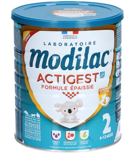 Il est important d'avoir une alimentation variée et équilibrée et un mode de vie sain.Modilac Actigest Lf+ 2 est la première formule épaissie enrichie en Lactoferrine d’origine bovine. La Lactoferrine est une protéine naturellement présente en grande quantité dans le lait maternel. Grâce à une expertise de pointe nous avons pu l’extraire du lait de vache d’origine française, tout en conservant ses propriétés d’origine. Ce savoir-faire nous a permis de développer la formule unique du lait infantile Modilac Actigest Lf+ 2, pour être toujours au plus proche du lait maternel.Des vitamines A, C, et D* qui contribuent au fonctionnement normal du système immunitaire.Du DHA* un acide gras de la famille des Oméga 3 qui contribuent au développement cérébral de votre enfant.Sans huile de palme.Fabriqué en Normandie à partir de bon lait normand, collecté dans un rayon maximal de 50 km.IngrédientsLait écrémé, huiles végétales (tournesol oléique, colza, tournesol), maltodextrines, lactosérum déminéralisé, amidon de maïs, lactose, protéines solubles de lait, émulsifiant (lécithine de soja), phosphate de calcium, huile de poisson, chlorure de potassium, phosphate de sodium, chlorure de calcium, bicarbonate de potassium, pyrophosphate ferrique, vitamine C, lactoferrine de lait de vache 0,08%, oxyde de magnésium, citrate de calcium, citrate de sodium, taurine, L-tyrosine, antioxydants (extrait riche en tocophérols, palmitate de L-ascorbyle), L-tryptophane, L-carnitine, sulfate de zinc, inositol, hydroxyde de potassium, bitartrate de choline, iodure de potassium, vitamine E, nicotinamide, sélénite de sodium, pantothénate de calcium, sulfate de cuivre, thiamine, vitamine A, vitamine B6, sulfate de manganèse, acide folique, vitamine K, biotine, vitamine D, vitamine B12, riboflavine, ferments lactiques (Bifidobacterium infantis).Données nutritionnellesÉnergie (kcal/kJ)Matières grasses (g)AG Saturés (g)Acide linoléique (mg)Acide α-linolénique (mg)DHA (mg)Glucides (g)Sucres (g)Lactose (g)Amidon (g)Maltodextrines (g)Fibres (g)Protéines (g)Caséine (g)Prot. solubles (g)Lactoferrine (mg)Vit A (µg-RE)Vit D (µg)Vit B1 (µg)Vit B2 (µg)Vit B3 (mg)Vit B5 (mg)Vit B6 (µg)Biotine (µg)Acide folique (µg-EFA)Vit B12 (µg)Vit C (mg)Vit K (µg)Vit E (mg α-TE)Sodium (mg)Potassium (mg)Chlorure (mg)Calcium (mg)Phosphore (mg)Magnésium (mg)Fer (mg)Zinc (mg)Cuivre (µg)Iode (µg)Sélénium (µg)Manganèse (µg)Fluorure (µg)Taurine (mg)Carnitine (mg)Choline (mg)Inositol (mg) 491/205862.4438044012360.631.131.111.318.2010.45.25.2704101150084543.2400171151704012155620475500330608438010021100<10035176853Poids net800 gFabricantSODILAC 68, rue de Villiers92532 Levallois-Perret ...