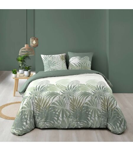 Plongez dans une ambiance tropicale douce et apaisante avec la parure de lit NYMEA. Son motif luxuriant de feuilles exotiques, décliné dans un camaïeu de verts tendres et de tons naturels, crée un véritable havre de fraîcheur dans votre chambre. Le fond clair met en valeur les feuillages imprimés avec finesse, tandis que le revers uni vert sauge apporte équilibre et sobriété. • Dimensions : Housse de couette 240 x 220 cm + 2 taies 63 x 63 cm • Composition : 100 % coton, tissage doux 57 fils/cm² • Motif : Dessin placé, imprimé jungle feuilletée en dégradé • Fermeture : Boutons pression résistants • Entretien : Lavage en machine à 40 °C, repassage facile ...