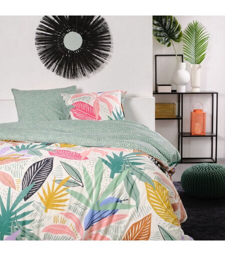 Parure de lit pour 2 personnes en coton avec imprimé végétal divers. 2 taies d'oreillers de dimensions 63 x 63 cm. Blanchiment interdit, repassage délicat 110°C, séchage basse température 60°C, nettoyage à sec interdit, 100% Coton, 57 Fils, 240x220cm, lavage 40°C, Pakistan . Couleur : Multicolore. Matière: Coton. Taille : 220 x 240 cm. Densité (fils par cm2) : 57 fils. Provenance : Pakistan. Forme : Taie carrée ...