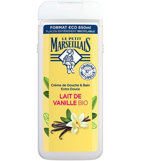 Redécouvrez les Gels Douche Extra Doux iconiques Le Petit Marseillais. Encore plus naturels et qui sentent toujours aussi bon !Le Petit Marseillais débute son histoire dans le sud de la France. Inspiré par la Provence et avec son envie irrésistible de vous faire plaisir, il crée ses gels douches Extra Doux.C’est à partir de gousses de Vanille Bio récoltées à la main puis longuement séchées que l’on obtient un délicat lait de vanille.Et ça sent trop trop bon !ApplicationDéposez une noix de produit au creux de votre main, faites mousser sur votre peau et laissez-vous emporter par le parfum de votre crème de douche 100% plaisir. Se rince facilement.Astuce : pour une mousse encore plus généreuse, utilisez une fleur de douche.IngrédientsAQUA, SODIUM LAURETH SULFATE, COCAMIDOPROPYL BETAINE, SODIUM CHLORIDE, GLYCERIN, VANILLA PLANIFOLIA FRUIT EXTRACT, ZEA MAYS STARCH, LEVULINIC ACID, SODIUM LEVULINATE, GLYCOL DISTEARATE, HYDROXYPROPYL METHYLCELLULOSE, XANTHAN GUM, CITRIC ACID, SODIUM HYDROXIDE, SODIUM BENZOATE, PARFUM, COUMARIN.*Nous vous recommandons de prendre connaissance de la liste d’ingrédients sur l’emballage du produit, celle-ci faisant foi ...