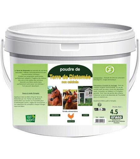 La terre de Diatomée est un produit aux propriétés asséchantes parfaitement adapté à l'hygiène des litière, des sols et des pattes des animaux.Terre de Diatomée non calcinée. 3 conditionnements : 1,25 kg, 2.5 kg et 4,5 kg Terre de Diatomée non calcinée 100% naturelle, Terre de Diatomée non calcinée extraite de carrières naturelles, raffinée mécaniquement et sans transformation chimique Produit aux propriétés asséchantes parfaitement adapté à l'hygiène des litières, des sols et des pattes des animaux. Garantit une litière sèche donc parfaitement saine pour vos animaux. Fort pouvoir absorbant, Produit 100% naturel Qualité grade alimentaire Idéale pour les box de chevaux, basse cour et clapiers, Vous pouvez aussi saupoudrez la terre de Diatomée dans votre maison, sur les tapis, panier pour éliminer les puces, mites et autres insectes rampants Elimine les mauvaises odeurs et désodorise la litière de votre chat. Il vous suffit d'en saupoudrez un peu dans son bac à litière Particulièrement ...