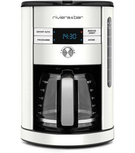 Préparez le café pour toute la famille avec cette cafetière filtre RIVIERA ET BAR BCF551. Avec ses nombreuses fonctionnalités, elle deviendra rapidement un indispensable du petit-déjeuner. Un réveil en douceur avec une délicieuse tasse de café La cafetière filtre RIVIERA ET BAR BCF551 se distingue par sa capacité à faire ressortir les arômes de votre café. Avec sa douchette multi-sorties 17 trous, vous obtiendrez une boisson savoureuse pour bien démarrer la journée. Quand votre café est prêt, elle affiche " Café prêt " sur son grand écran digital. La cafetière se programme jusqu'à 24h à l'avance, l'idéal pour ceux qui sont toujours pressés le matin ou qui n'ont pas entendu leur réveil sonner. Le temps que vous vous prépariez, la machine prépare votre boisson et la maintient au chaud pendant 30 minutes. Vous commencez la journée sans stress et parfaitement réveillé. Une cafetière facile d'utilisation Avec la cafetière filtre RIVIERA ET BAR BCF551, réaliser votre boisson préférée est très simple. Sélectionnez vos réglages à l'aide de la molette Easy Select et laissez la machine s'occuper du reste. Vous pourrez également choisir entre petites et grandes tasses avec le niveau d'eau gradué. Compatible avec des filtres papier 1x4 et 1x6, cette cafetière s'adapte à toutes les situations. Lorsqu'elle nécessite un détartrage, son écran vous le signale. Son design bien pensé permet de voir le niveau d'eau du réservoir en un coup d'oeil et de savoir avec précision quand votre café est prêt à être dégusté. ...
