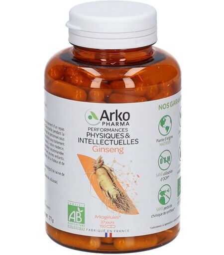 Complément alimentaire à utiliser dans le cadre d'une alimentation variée, équilibrée et d'un mode de vie sain.Arkogélules® BIO Ginseng, une formule d’origine biologique, restituant 100% des actifs de la planteLe Ginseng, grâce à son action tonifiante et stimulante, favorise les capacités physiques.Les Arkogélules® BIO Ginseng, vous apportent chaque jour :29 mg de ginsénosidesLa racine de Ginseng est surtout réputée pour sa richesse en ginsénosides, substances caractéristiques de cette plante, dont la teneur augmente avec la maturité de la racine.Egalement antioxydant, le Ginseng aide les cellules à lutter contre le stress oxydatif causé par les radicaux libres. Ceux-ci peuvent provenir de différentes sources : pollution, UV, stress... Le Ginseng aide ainsi à préserver plus longtemps la jeunesse de vos cellules.Son usage traditionnel en phytothérapie, initialement réservé à l'Empereur et aux grands seigneurs féodaux, remonte à l'Antiquité. Aujourd'hui, le Ginseng est essentiellement utilisé pour son action tonique générale sur les performances physiques et intellectuelles. En Chine, le Ginseng est encore utilisé comme aphrodisiaque masculin.Le Ginseng (Panax Ginseng) est une plante vivace avec une racine volumineuse plus ou moins ramifiée de couleur jaune clair et pouvant avoir un aspect anthropomorphe. On doit attendre que la plante ait atteint au minimum 6 ans d'âge pour en récolter sa racine.IngrédientsPoudre (Totum intégral) de racine de Ginseng BIO (Panax Ginseng)GÉLULE 100% VÉGÉTALE (dérivé de cellulose)Données nutritionnelles Pour 4 gélulesPoudre de racine de Ginseng1560 mgConcentration en ginsénoisdes29 mgConseils d'utilisationsVoie orale. À partir de 15 ans.Prendre 4 gélules en une seule prise le matin au moment du repas avec un grand verre d’eau.Précautions d'emploiNon recommandé pendant la grossesse et l’allaitement en l’absence de données suffisantes.Déconseillé chez les personnes sous traitement antidiabétique.Le Ginseng peut interagir avec les traitements anticoagulants de la classe des anti-vitamines K.Demandez conseil à votre médecin.Ne pas dépasser la dose journalière recommandée.Un complément alimentaire ne doit pas se substituer à une alimentation variée et équilibrée et à un mode de vie sain.Ne pas laisser à la portée des jeunes enfants.À conserver à l’abri de la lumière, de la chaleur et de l’humidité.Poids net150 gélulesFabricantArkopharmaBP 2806511 CARROS Cedex ...