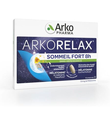 Complément alimentaire à utiliser dans le cadre d’une alimentation variée, équilibrée et d’un mode de vie sain.Difficultés à vous endormir ? Réveils nocturnes ? Nuit trop courte et journée perturbée ?Arkorelax® Sommeil Fort 8H est le 1er produit sommeil des laboratoires Arkopharma agissant selon les principes de la chronobiologie, en apportant de la mélatonine et des plantes en libération rapide et prolongée.Arkorelax® Sommeil Fort 8H délivre grâce à un comprimé bicouche innovant : La dose optimale de mélatonine en libération rapide et en libération prolongée, pour une nuit complète, de l’endormissement jusqu’au réveil. Une haute concentration de plantes reconnues pour leurs propriétés sur le sommeil : la Passiflore et la Valériane, en libération rapide, aidant à la relaxation et l’Eschscholtzia, en libération prolongée, contribuant à diminuer les réveils nocturnes. 76 % de satisfaction* * Étude observationnelle en vraie vie réalisée en 2018, évaluation par une échelle validée. Score compris entre 20 et 24, 33 personnes.Arkorelax® Sommeil Fort 8H est conseillé en cas de difficultés d’endormissement, de réveils nocturnes ou précoces.Arkorelax® Sommeil Fort 8H est composé d’un comprimé bicouche innovant : La 1ère couche à libération rapide contient 1 mg de Mélatonine qui favorise un endormissement plus rapide. La Passiflore et la Valériane facilitent votre détente, La 2ème couche libère progressivement 0,9 mg de Mélatonine, de la Vitamine B6 et de l’Eschscholtzia. Cette plante aide à limiter les réveils nocturnes et à retrouver un sommeil réparateur et de qualité. Arkorelax® Sommeil Fort 8H ne provoque pas d'accoutumance ou de somnolenceComposition:Agent de charge : cellulose - Extrait de partie aérienne d’Eschscholtzia (Eschscholtzia californica Cham.) – Extrait d’organe souterrain de Valériane (Valeriana officinalis L.) – Extrait de partie aérienne de Passiflore (Passiflora incarnata L.) – Antiagglomérants : acide stéarique, talc, stéarate de magnésium et gomme de cellulose réticulée – Maltodextrine – Concentré colorant de spiruline – Amidon de riz – Mélatonine – Vitamine B6.Pelliculage : agents d'enrobage : hydroxypropylméthylcellulose, hydroxypropylcellulose, acide stéarique, cellulose, éthylcellulose, et cire de carnauba. Sans dioxyde de titane. Sans lactose. Sans gluten.Valeur nutritionnelle: Pour 1 comprimé Équivalence plante sèche Couche à libération rapide Mélatonine 1 mg Extrait d’organe souterrain de valériane 150 mg 900 mg Extrait de partie aérienne de passiflore 100 mg 500 mg Couche à libération prolongée Mélatonine 0.9 mg Vitamine B6 0.7 mg (50% AJR*) Extrait de partie aérienne d’Eschscholtzia 160 mg 480 mg ***Apport journalier de référence.Conseil d'utilisation:Réservé à l’adulte.Prendre 1 comprimé par jour 1 heure avant le coucher, à avaler avec un grand verre d’eau. La mélatonine aide à réduire le temps d’endormissement. Cet effet est obtenu dès la consommation d’1 mg avant le coucher.Précautions d'emploi: Déconseillé chez... ...